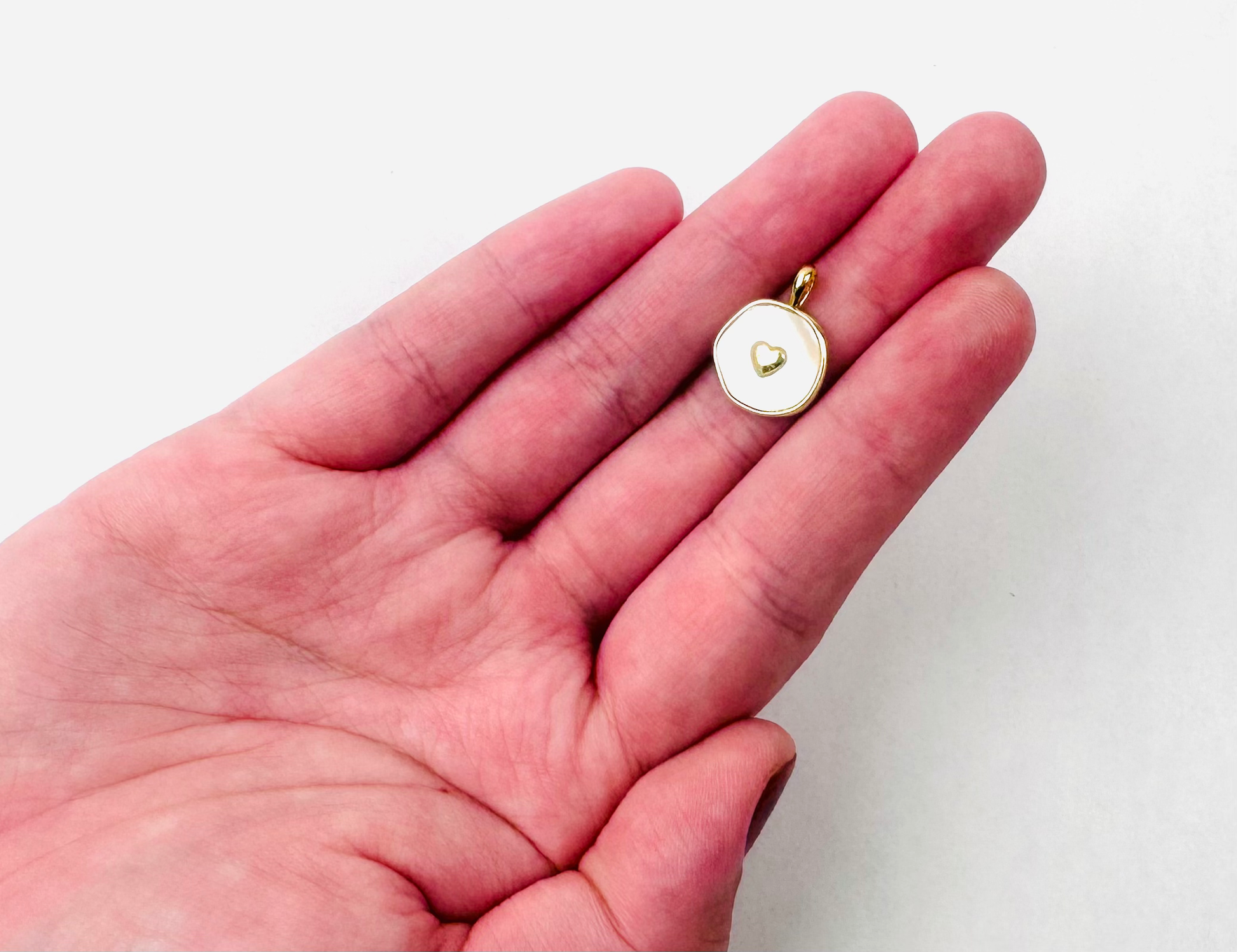 A sweet touch of love. This round charm features a raised heart over a luminous mother-of-pearl and Paua shell base, framed in your choice of 18K gold-filled or silver finish.